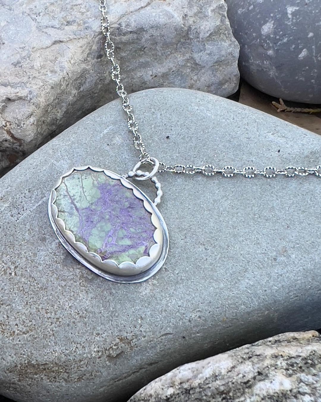 Stitchtite is a a fabulous purple mineral that is found in a few small deposits around the world. Majority , however, are from the island of Tasmania, off the coast of Australia.