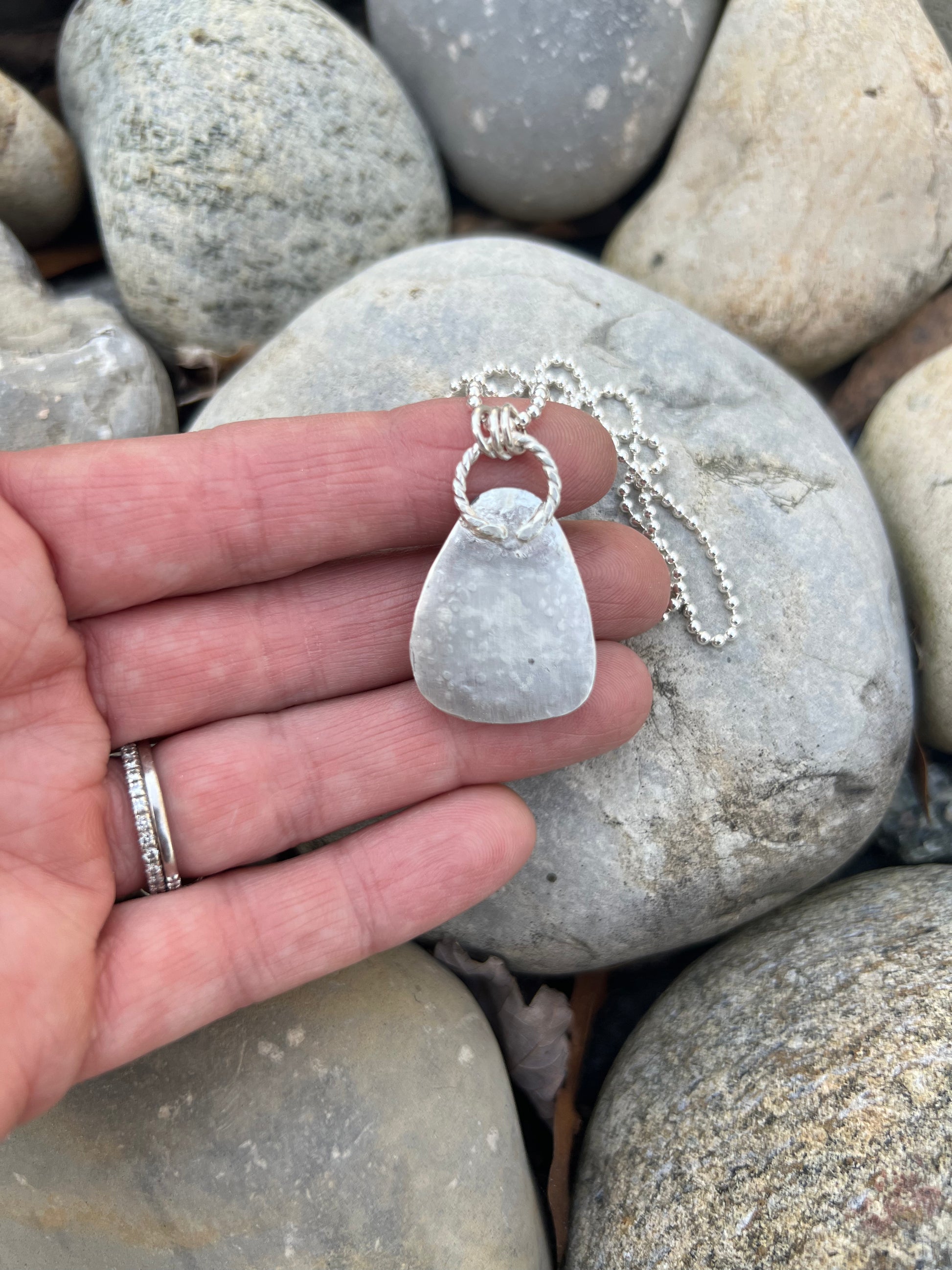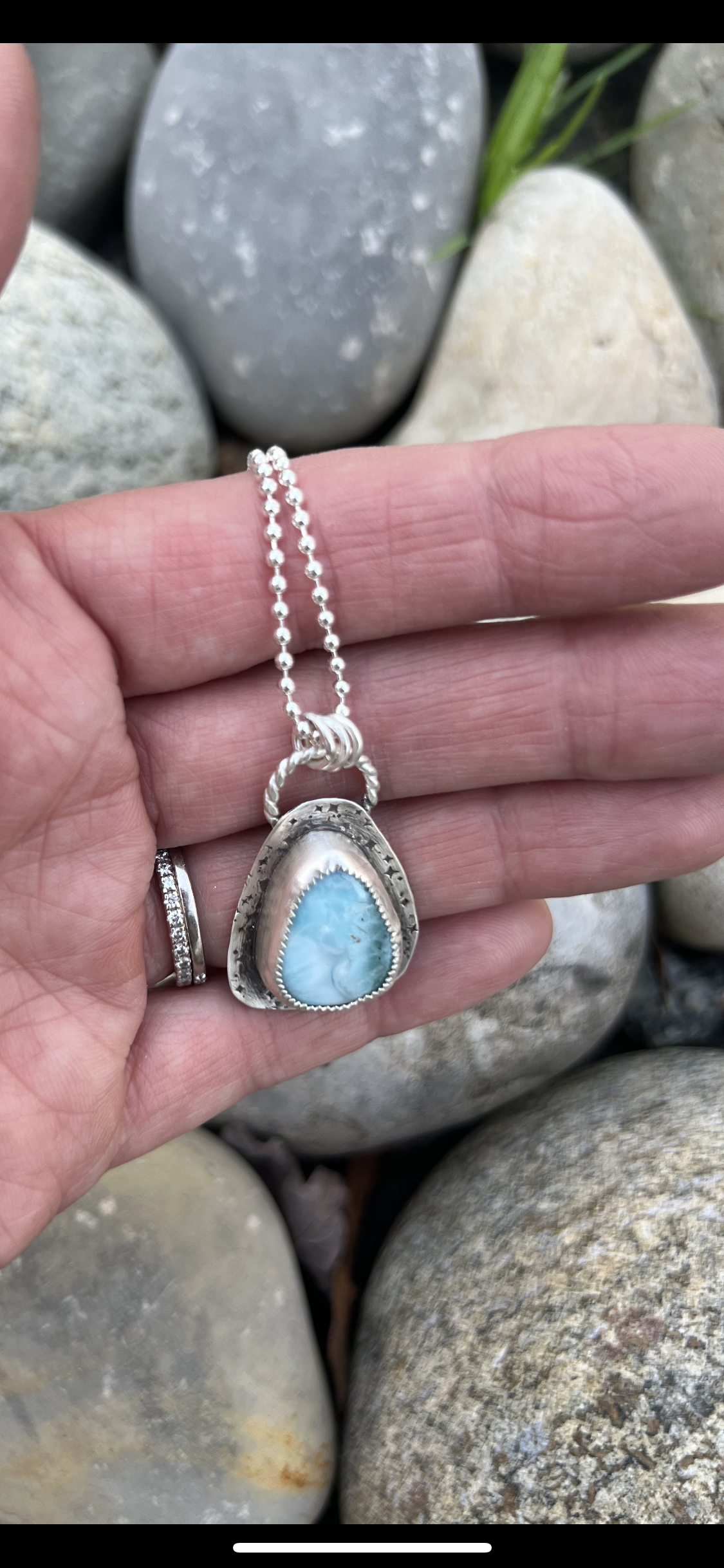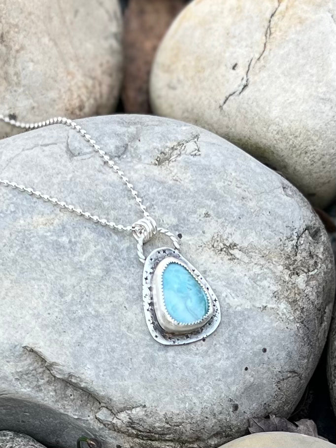 Turquoise set in fine silver and sterling silver. 20” Sterling chain included